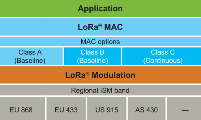可以看到一個LoRaWAN網絡架構中包含了終端、基站、NS(網絡服務器)、應用服務器這四個部分。基站和終端之間采用星型網絡拓撲,由于LoRa的長距離特性,它們之間得以使用單跳傳輸。在終端部分官方列了6個典型應用,有個細節,你會發現終端節點可以同時發給多個基站。基站則對NS和終端之間的LoRaWAN協議數據做轉發處理,將LoRaWAN數據分別承載在了LoRa射頻傳輸和Tcp/IP上。