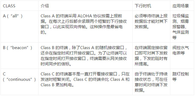 在開頭的介紹中我們就看到有協議中有規定 Class A/B/C 三類終端設備,這三類設備基本覆蓋了物聯網所有的應用場景。為了方便大家,做了一個表。